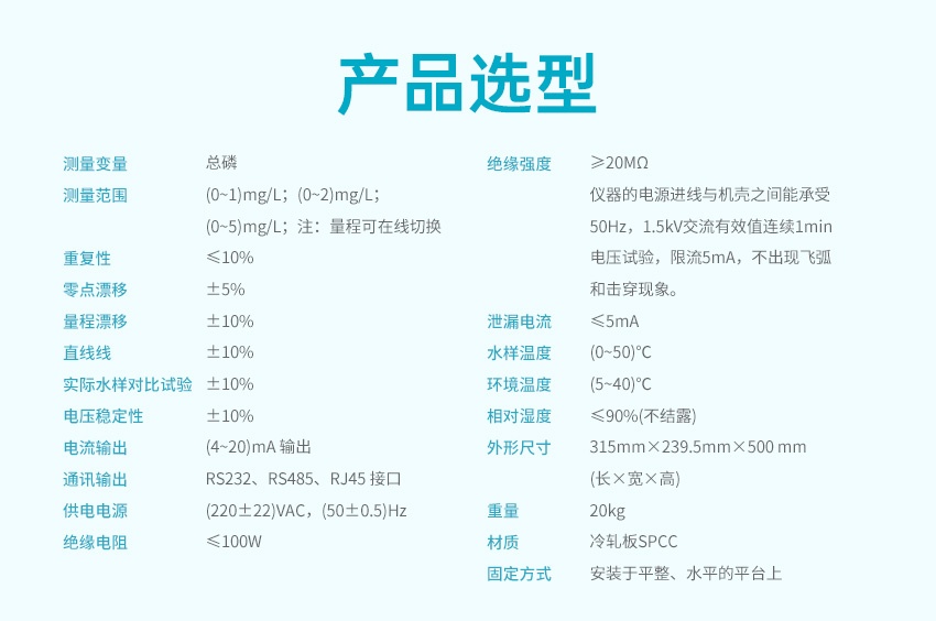 TP 型总磷水质在线分析仪采用钼酸铵分光光度法检测,符合《总磷水质自动分析仪技术要求》(HJ/T 103)、《水质 总磷的测定 钼酸铵分光光度法》(GB 11893)、《污染物在线自动监控(监测)系统数据传输标准》(HJ 212)、《地表水自动监测仪器通信协议技术规定》等标准和规范的要求。