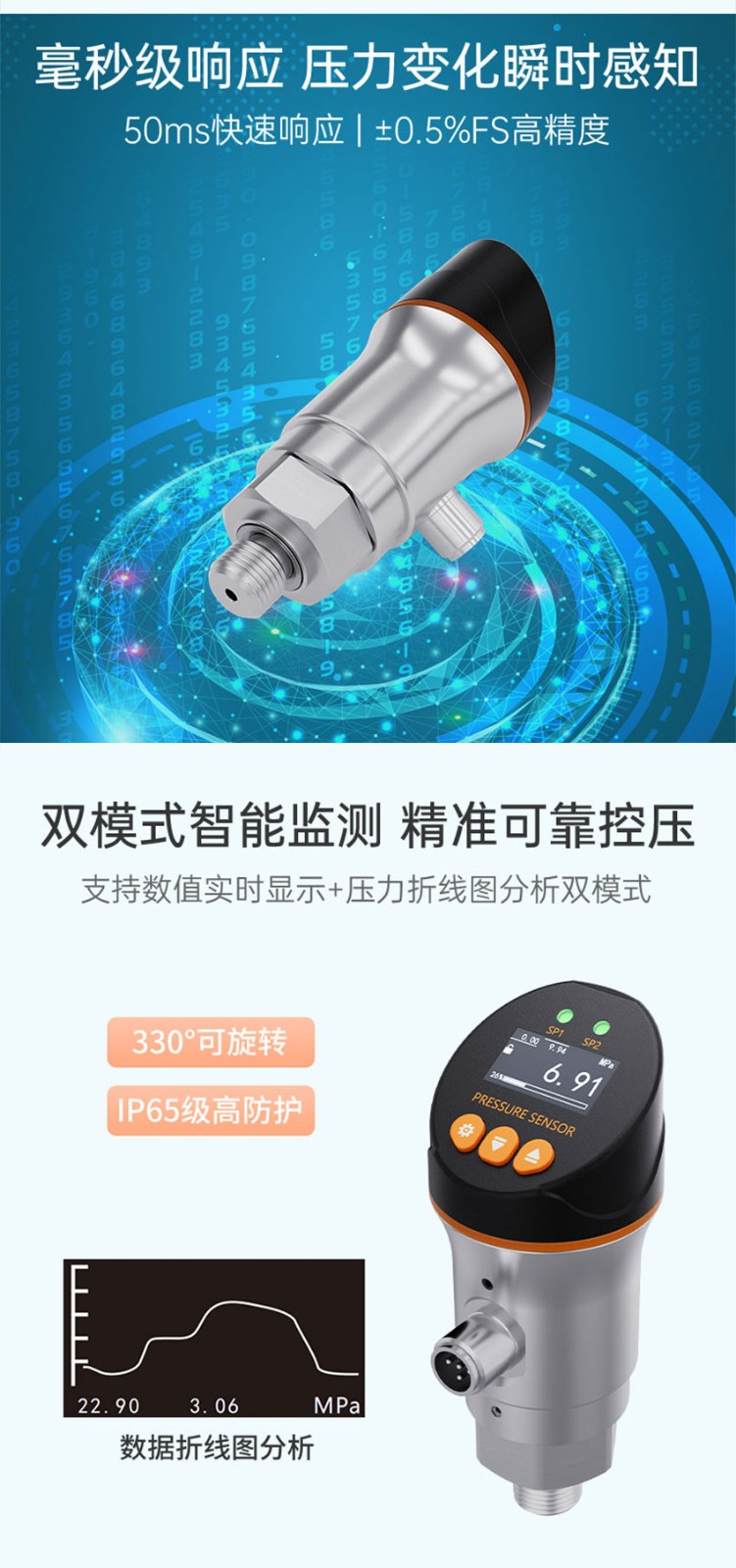 PS100压力开关 0.5级高精度,测量更可靠;快速响应时间仅0.05s;IP65防护等级,适合工业现场使用