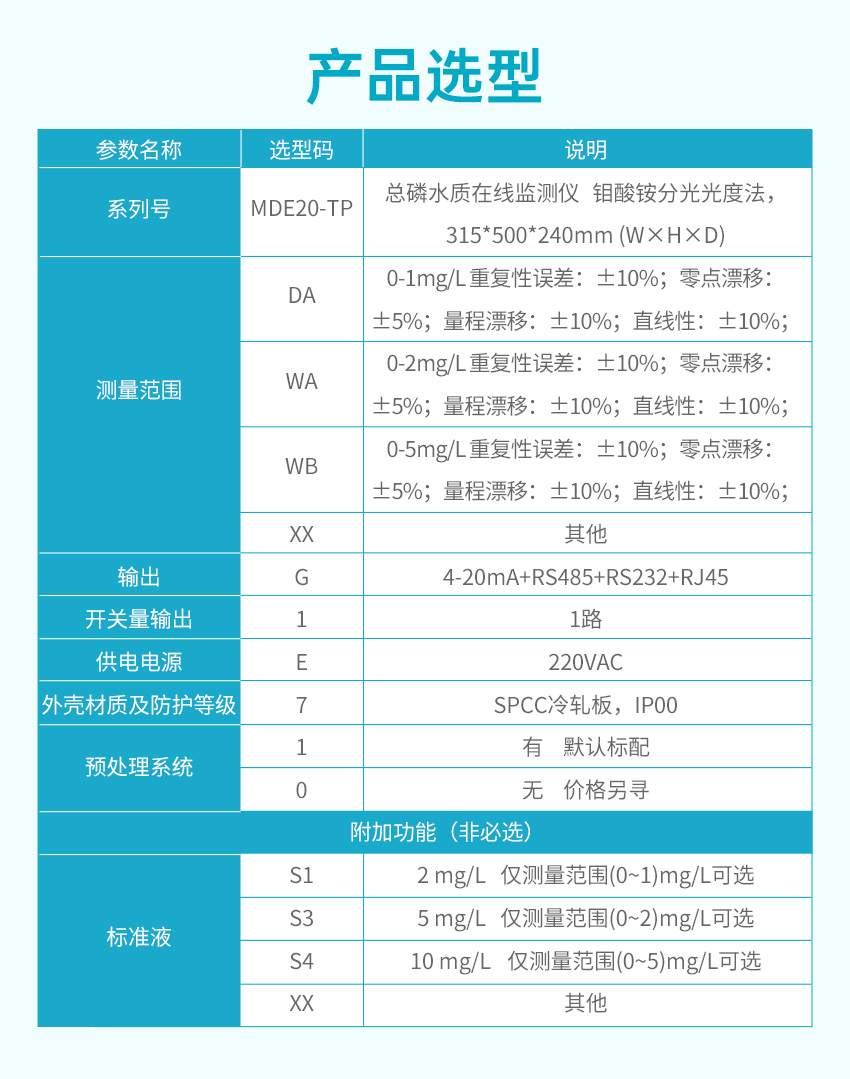 TP 型总磷水质在线分析仪采用钼酸铵分光光度法检测,符合《总磷水质自动分析仪技术要求》(HJ/T 103)、《水质 总磷的测定 钼酸铵分光光度法》(GB 11893)、《污染物在线自动监控(监测)系统数据传输标准》(HJ 212)、《地表水自动监测仪器通信协议技术规定》等标准和规范的要求。