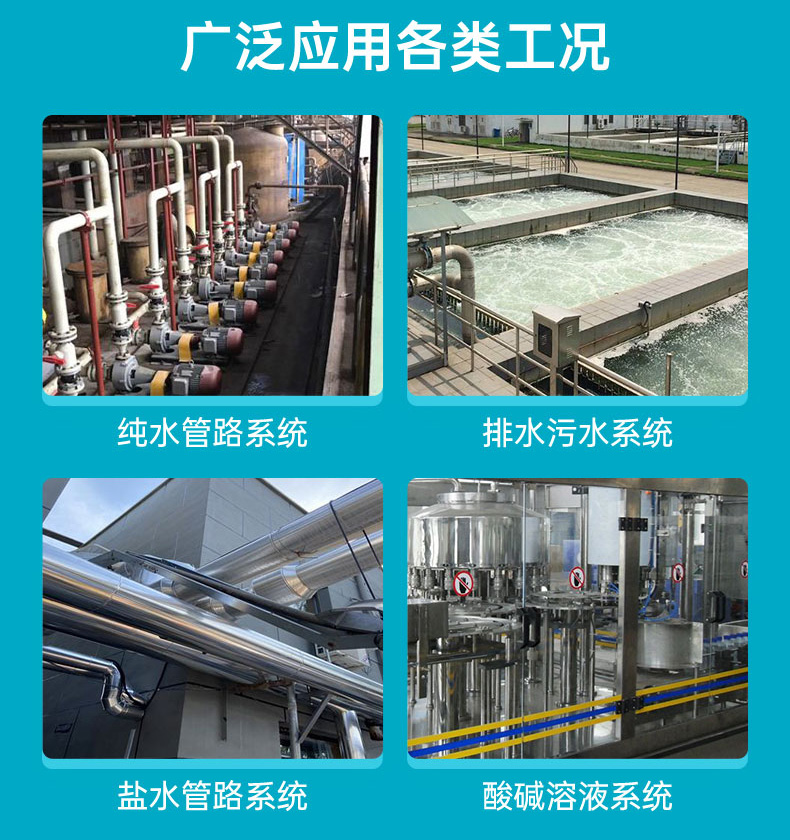本产品主要应用在:污水处理排水系统、酸碱溶液流量控制系统、纯水管路系统中的流体控制。