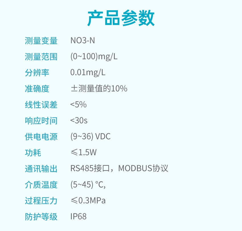 ADI5050款硝氮电极是基于紫外光吸收法测量,一种利用紫外光谱分析技术,直接、快速、准确地测量水体中硝态氮(NO₃-N)浓度的先进在线监测设备。通过校正公式消除有机物干扰,最终根据朗伯-比尔定律将计算出的净吸光度值实时转换为硝酸盐氮(NO3-N)的浓度值,并通过数字信号输出。
