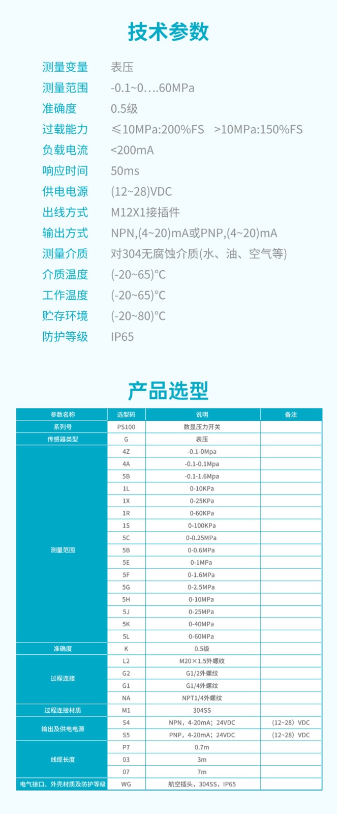 PS100压力开关 0.5级高精度,测量更可靠;快速响应时间仅0.05s;IP65防护等级,适合工业现场使用