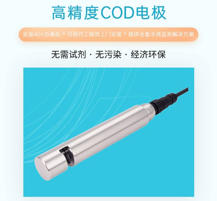 COD 电极是一种用于测量水样中化学需氧量的设备。电极无需试剂、无污染、更经济环保。可长期在线进行水质监测。传感器内部集成一路浊度检测光源、可对被测水体浊度干扰自动补偿,传感器带有自动清洁刷装置,即使长期监测依然具有极佳的稳定性。